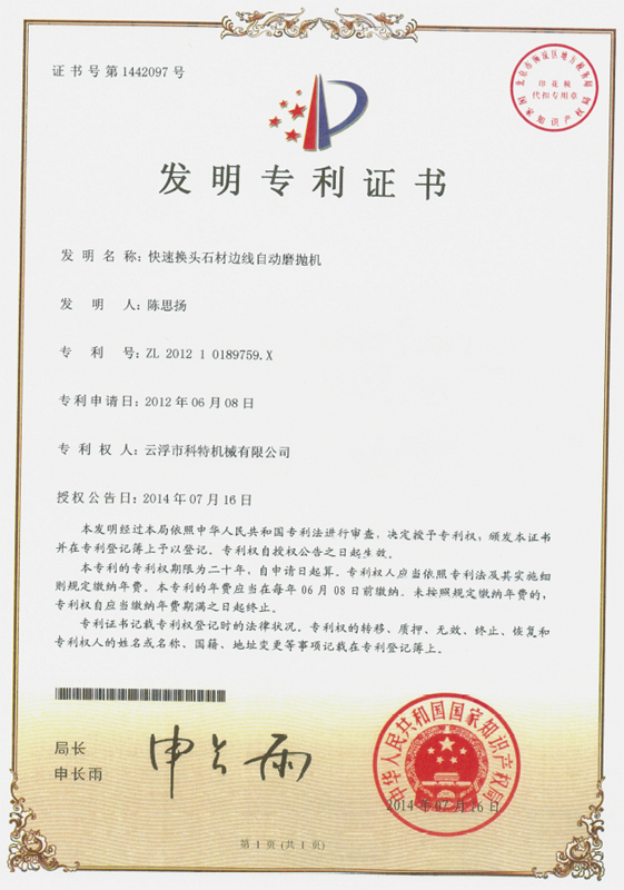 企業(yè)組建了“云浮市石材機(jī)械裝備工程技術(shù)研究開發(fā)中心”,并與高校和科研院所密切合作,致力于光機(jī)電一體化產(chǎn)品的研發(fā)、生產(chǎn)、銷售和服務(wù)。主要產(chǎn)品有框架鋸、全自動連續(xù)磨拋機(jī)、橋式自動切割機(jī)、全自動仿形石線機(jī)、數(shù)控金剛石繩鋸、裁切機(jī)等。產(chǎn)品具有自動化程度高、加工精度高和生產(chǎn)效率高等特點(diǎn)。產(chǎn)品除國內(nèi)銷售外,還出口到歐美、東南亞、韓國、印度、中東、非洲、俄羅斯、澳大利亞等國家和地區(qū),深受用戶好評!皹蚴阶詣忧懈顧C(jī)”被認(rèn)定為廣東省高新技術(shù)產(chǎn)品,擁有發(fā)明專利1項、實(shí)用新型專利1項。
